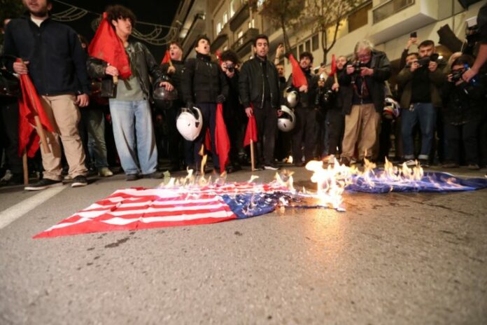 Νωρίτερα, στο τέλος της πορείας και υπό αντιπολεμικά συνθήματα, μια ομάδα διαδηλωτών προχώρησε στην καύση σημαίων των ΗΠΑ και του ΝΑΤΟ, εκφράζοντας έτσι τις διαμαρτυρίες τους για τις πολιτικές των συγκεκριμένων χωρών.