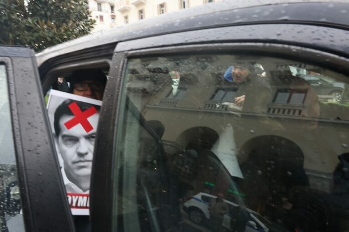 Παρά την απαγόρευση συγκεντρώσεων που είχε επιβληθεί από την Αστυνομική Διεύθυνση, ομάδα διαμαρτυρομένων πλησίασε το κτήριο τη στιγμή που ο Τσίπρας ετοιμαζόταν να μιλήσει.