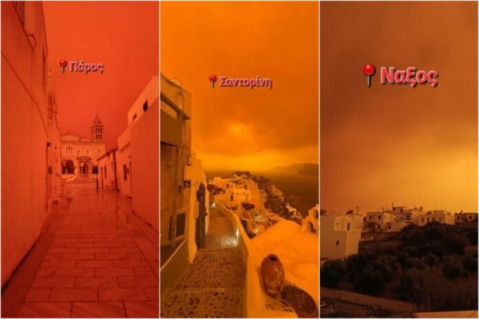 Σκηνές που θυμίζουν ταινία επιστημονικής φαντασίας για τον «κόκκινο πλανήτη» καταγράφηκαν την Τετάρτη 1/4, όταν αρκετά νησιά της Ελλάδας «βυθίστηκαν» κάτω από ένα παχύ, πορτοκαλί στρώμα αφρικανικής σκόνης. Όχι μόνο η Κρήτη επηρεάστηκε, αλλά και άλλες περιοχές όπως η Πάρος, η Νάξος, η Μύκονος, η Σαντορίνη, η Σέριφος, η Σύρος, η Σίφνος, η Αμοργός, η Αστυπάλαια και η Φολέγανδρος παρουσίασαν αντίστοιχες εικόνες.