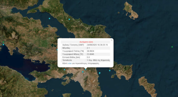 Σεισμική δόνηση σημειώθηκε πριν από λίγα λεπτά στην Αθήνα. Σύμφωνα με το Γεωδυναμικό Ινστιτούτο, η ένταση της δόνησης καταγράφηκε στα 2,1 Ρίχτερ. Το επίκεντρο της σεισμικής δραστηριότητας εντοπίζεται 1 χιλιόμετρο βόρεια βορειοδυτικά της Κηφισιάς, με το εστιακό βάθος να είναι στα 5 χιλιόμετρα.