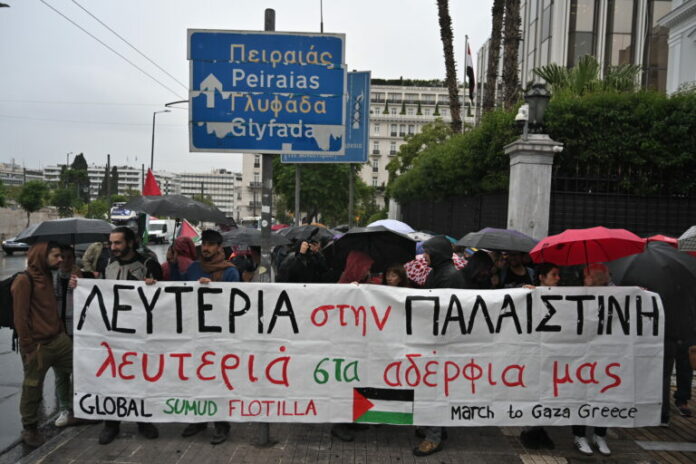 Περίπου 150 πολίτες ανταποκρίθηκαν στο κάλεσμα της κίνησης March to Gaza και συγκεντρώθηκαν στις 10 το πρωί έξω από το Υπουργείο Εξωτερικών, εκφράζοντας τη διαμαρτυρία τους για την αναχαίτιση των πλοίων της ελληνικής αποστολής που κατευθύνονταν προς τη Γάζα.