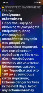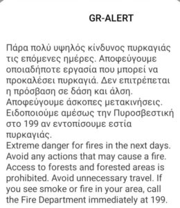Το μήνυμα ανέφερε τον πολύ υψηλό κίνδυνο για φωτιά που υπάρχει τόσο στην Ελλάδα όσο και σε όλη τη χώρα.Αντίστοιχο μήνυμα έχει σταλεί σε όλες τις περιοχές της χώρας και είναι μια προειδοποίηση προς όλους, καθώς το κύμα καύσωνα επιμένει.