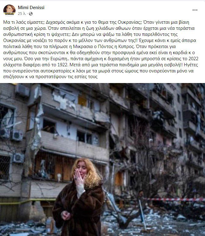 «Μα τι λαός είμαστε;; Διχασμός ακόμα και για το θέμα της Ουκρανίας; Όταν γίνεται μια βίαιη εισβολή σε μια χώρα. Όταν απειλείται η ζωή χιλιάδων αθώων, όταν έρχεται μια νέα τεράστια ανθρωπιστική κρίση τι ψάχνετε;; Δεν μπορώ να ψάξω τα λάθη του παρελθόντος της Ουκρανίας, με νοιάζει το παρόν και το μέλλον των ανθρώπων της» έγραψε χαρακτηριστικά.